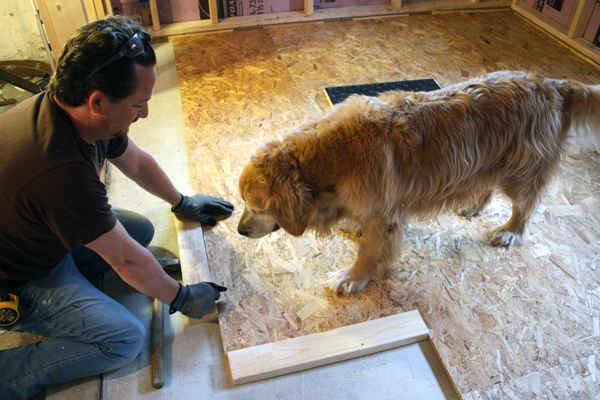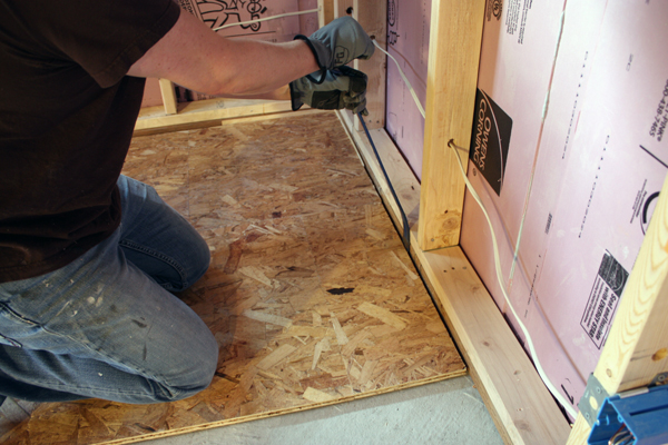 At the edges, he used a pry bar pushed against the sill plate to ensure a tight fit.