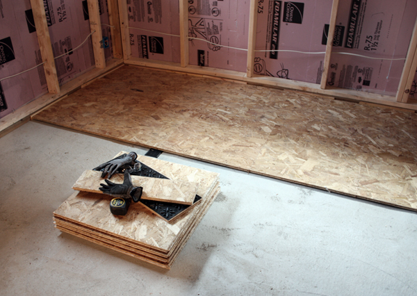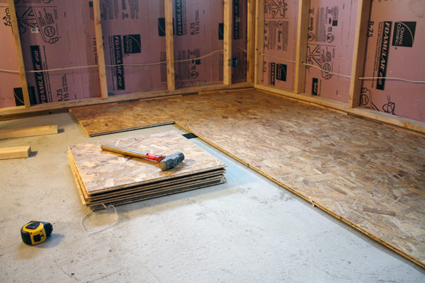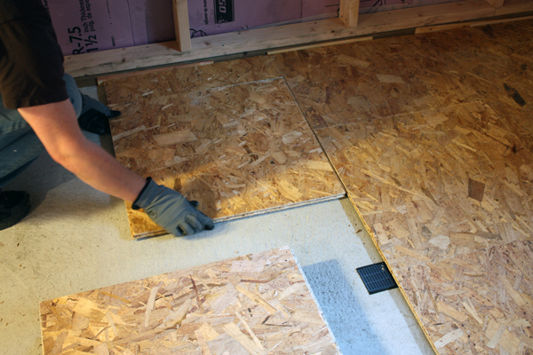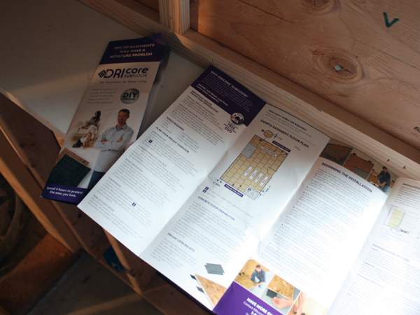 Before the weekend was over, Kyle also got started on the Dri-Core subfloor (he’s actually installing the last pieces as I type). The 2’x2′ panels are comprised of a layer of OSB over a black dimpled plastic. Even though we installed a moisture barrier under the new topping slab, the plastic backing provides an airspace and keeps any water that might find its way in from coming up through the floor.
