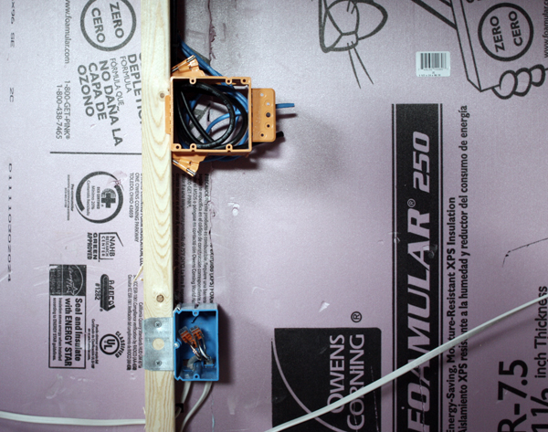For a small project like this, we just talked through where we would want outlets, switches and fixtures instead of producing an electrical plan. Our main goal was to come up with a layout that would provide the most flexibility whether the space is being used as a TV room or bedroom. Because of our short ceiling height, the biggest challenge to figure out was lighting. Obviously, you don’t want anything hanging down and recessed cans wouldn’t work with our exposed joists. So the plan is to install a couple of wall sconces (you can see the round electrical box for one in the photo above) that flank what will eventually be a built-in media/storage unit.