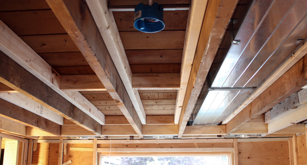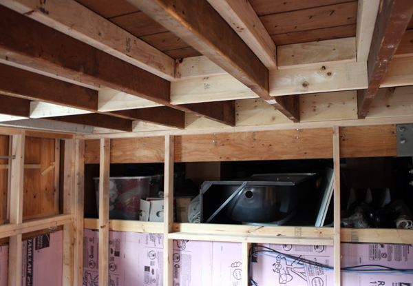To make the space feel taller we’re leaving the joists exposed but the actual detail is a bit trickier. Unlike our living room ceiling, in the basement we have to contend with all the exposed nails coming through the subfloor from the old oak floors above (that are now covered with plywood and cork). Our solution was to furr down with 2×4’s and then attach sheetrock to that. Finally, we’ll sand up the joists a bit and then paint everything super white.