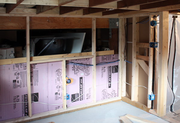 On the opposite wall Kyle roughed in power, data and cable. The TV/DVD/Xbox are in the living room for now, but the plan is to eventually move everything downstairs. I’m hesitant to use the words “media room” or “man cave” but we do see this room as a cozy space to watch movies.