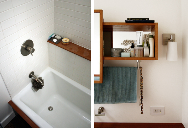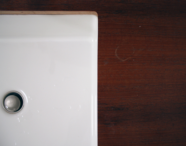 Back in 2008, IKEA didn’t have nearly the number of bathroom vanity options that they do today. Our solution was to attach a simple cabinet unit to a 3-drawer unit and wrap the top and side with teak plywood. (We like to put vanities on legs in small spaces, which makes them feel more like a piece of furniture and not so bulky.)