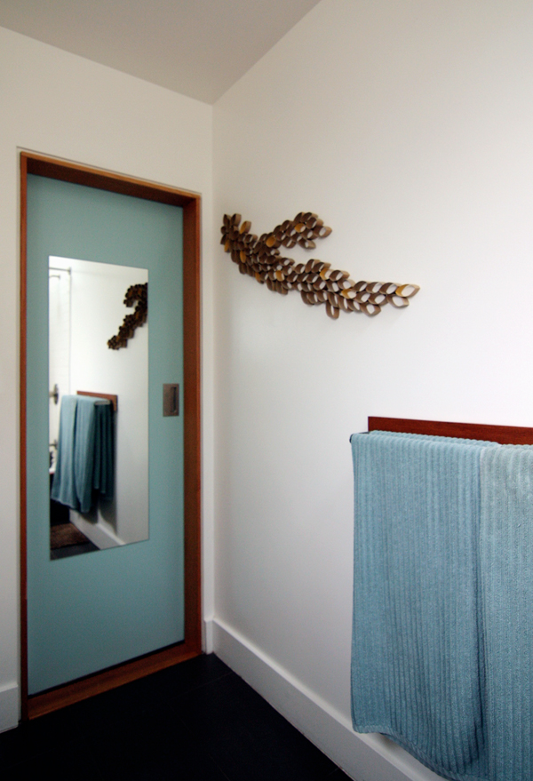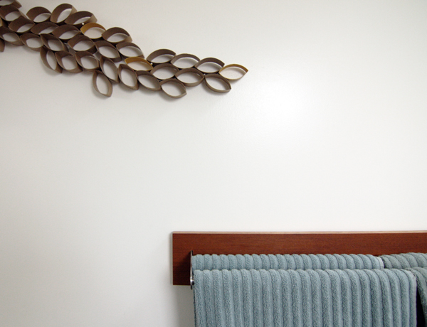 Despite the many doubtful comments I’ve received on the subject, my toilet paper roll art is still going strong! We used a clear acrylic spray on the pieces and our bathroom has a good exhaust fan, so moisture has never been an issue. I’ll probably grow tired of if at some point, but not yet.