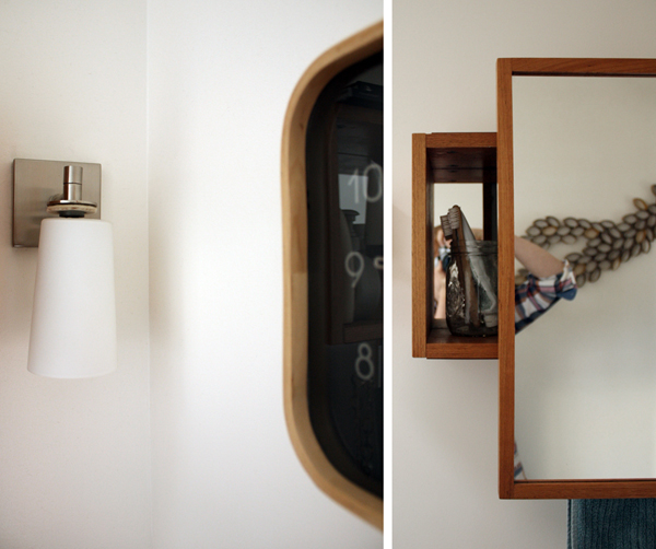 The medicine cabinet was from the IKEA Molger line (though has since been discontinued). I like the design but sometimes I wish our more frequently used items weren’t on display. The back panel is a piece of masonite with a mirror attached, which I never really understood because it just multiplies the visual clutter. I’ve toyed with the idea of flipping the masonite and painting it a fun color, but it’s a low priority (obviously).