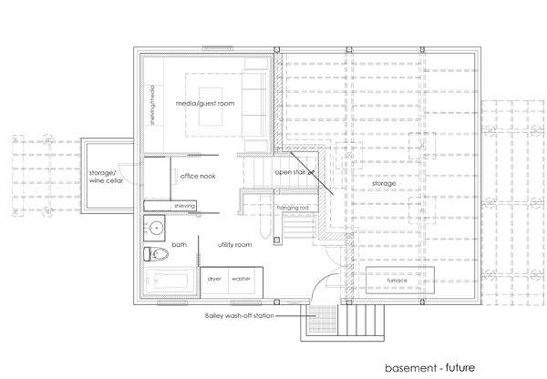 So, everything except the bedroom, bathroom and front porch will be next year’s project. Daunting? Not really. I think we’ve learned a lot of valuable lessons during our previous projects and have also been able to plan ahead. For instance, when the furnace was installed they stubbed out for the new gas range and the duct work and registers were located with the remodel in mind. When we re-did the plumbing we made sure that the new kitchen lines would easily tie in to the existing system and all the windows have been replaced. There will also be a demo party. Oh yes. So hopefully, this time next year we can post a current plan that looks something close to the “future” plan (we probably won’t get to the basement till 2011). Of course, we don’t currently own about half the furniture shown in that plan (we’ve been coveting Eames plywood chairs for the living room), so we may be embracing a very minimalist look for awhile.