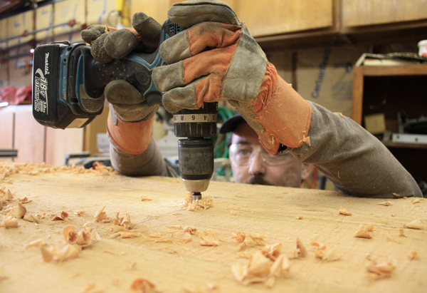 Enough with the steel, time for wood! In addition to biscuits and glue, Kyle decided to install four hidden pieces of 3/8″ all-thread that would literally tie the two pieces of wood together and create a stronger connection. To do this, he first had to drill a series of parallel 1-3/4″ deep holes using a 1-1/2″ diameter forstener bit. To ensure he wasn’t over drilling, he kept an eye level view as he went, stopping when the blue tape line on the drill bit was aligned with the top of the wood.
