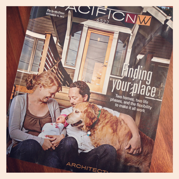 On Sunday, we (and another family) were featured in the Seattle Times(!) in the Pacific NW magazine’s annual architecture issue. Becky Teagarden wrote the article and Ben Benschneider took the photos, coming out to our house on three different occasions to document the progress (on the house and my belly!). The family photo was taken about a week after Avery’s arrival. It was a great experience working with both Becky and Ben and we’re humbled by the story. And yes, Bailey photobombed almost every single image.