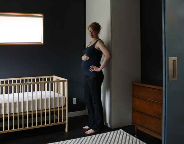 The color looks great (and so do you!). I think a dark color in a nursery is the way to go. We did our daughter’s in a crazy dark indigo/purple and I love how cozy and dark it makes the room feel.