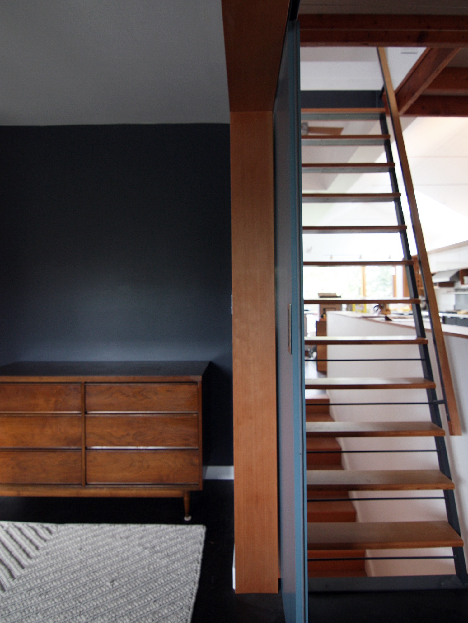 I’ve tried to show it accurately in these photos, but to be honest, the color varies considerably depending on the light and can read anywhere from a dusty gray-blue to a deeply saturated black-blue. (I took these photos today, in overcast evening light.) I opted to leave the ceiling and base trim white, which I think provides a nice contrast to the dark walls and floors and fir trim (and really, I hate painting ceilings).