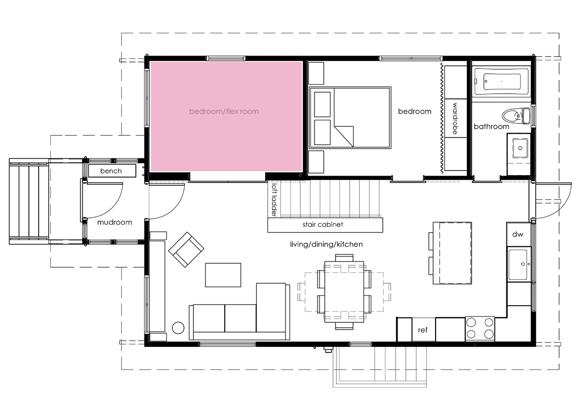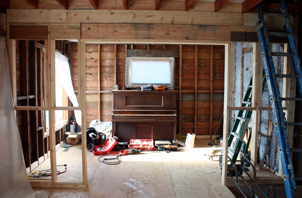 There was a subtle framed opening separating the 1910 living room from the 1910 dining room, but because we wanted to make it more of a separate space, we added a framed wall with a smaller opening. We thought about just adding a standard door, but thought it would look awkward and the larger sliding doors gave us more flexibility as our needs change.