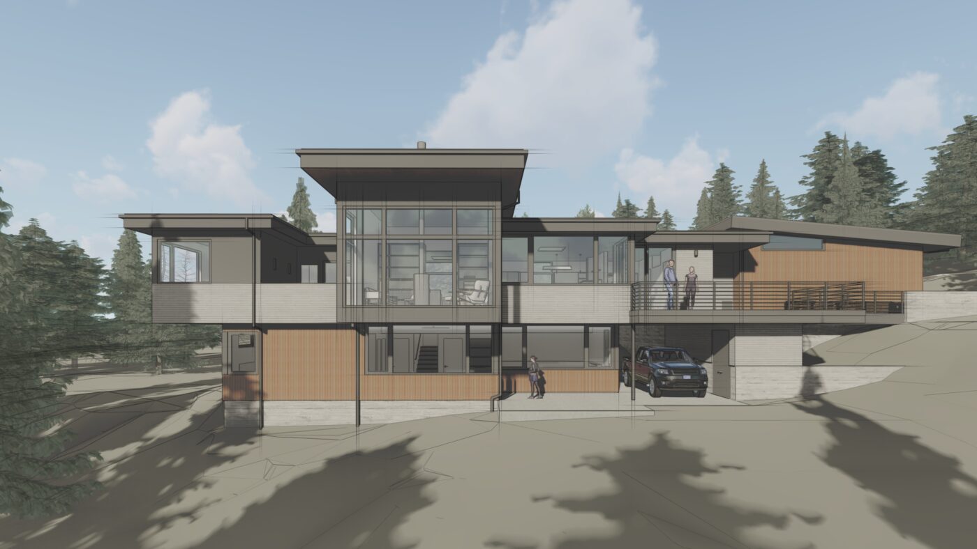 The exterior features a driveway that passes underneath the house to allow easy access to the lower part of site for boating and fishing on the river. The interior of the home is designed to reflect its natural surroundings, with warm, earthy tones, and organic materials such as stone, wood, board-formed concrete, and metal. The use of natural materials and textures creates a connection between the indoor and outdoor spaces, blurring the lines between the two.