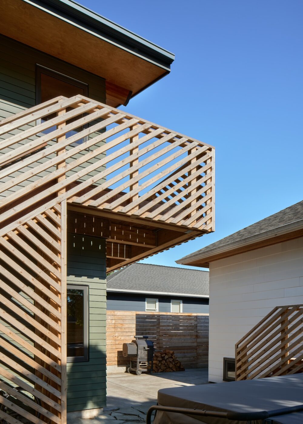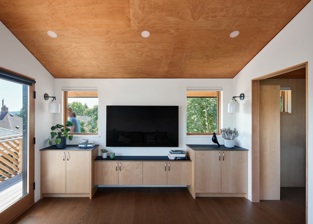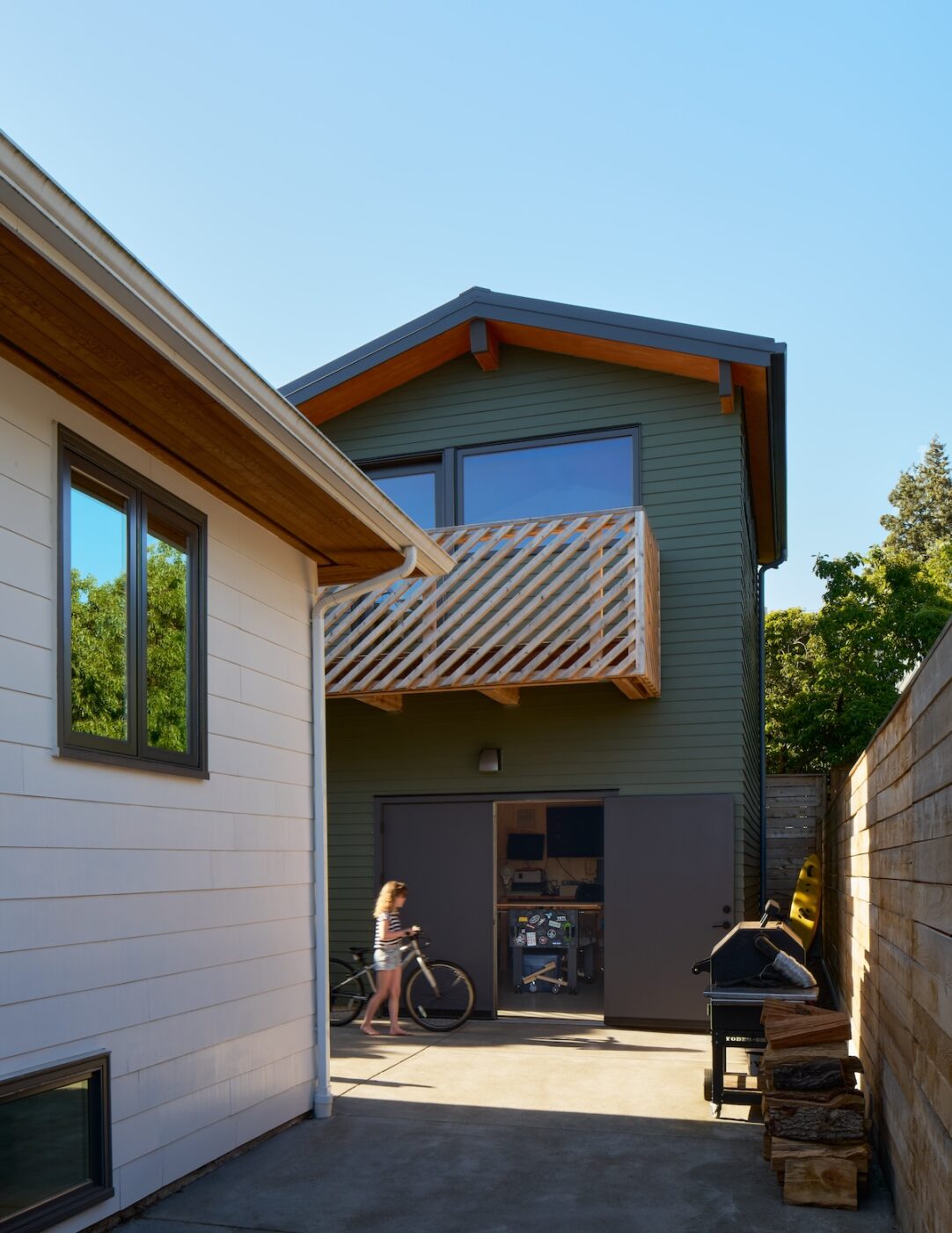 The workshop space below is more utilitarian, with double doors that can open up to the patio beyond. An exterior stair frees up interior space while adding a bit of playfulness to the design with the diagonal wood railings. The outdoor unit for the heat pump is strategically placed under the stair, with a removable access screen and just enough space to hang a few bikes.