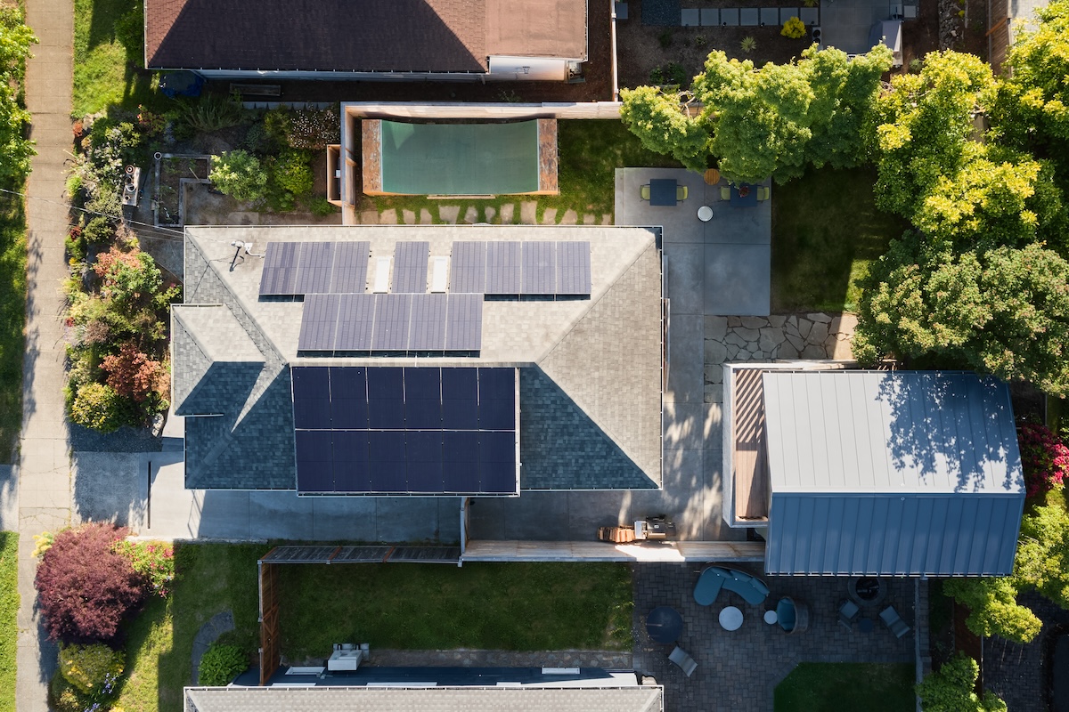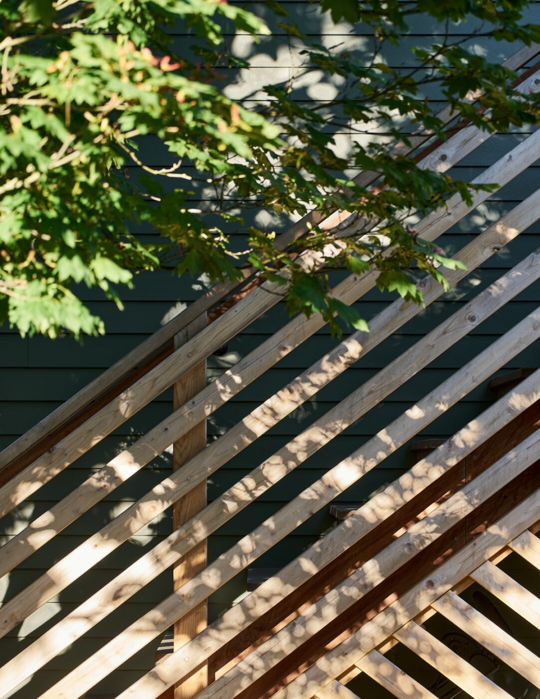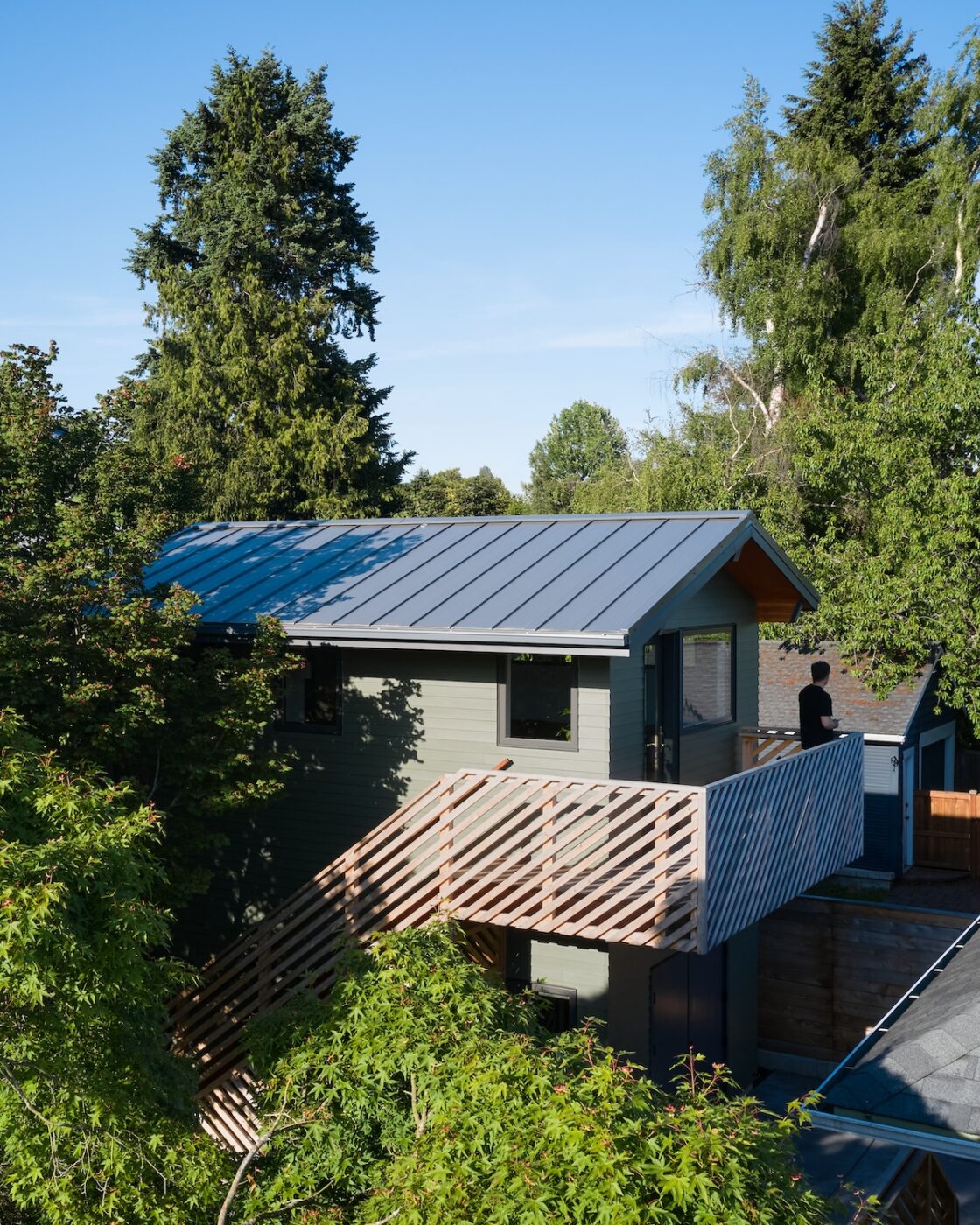 The workshop space below is more utilitarian, with double doors that can open up to the patio beyond. An exterior stair frees up interior space while adding a bit of playfulness to the design with the diagonal wood railings. The outdoor unit for the heat pump is strategically placed under the stair, with a removable access screen and just enough space to hang a few bikes.