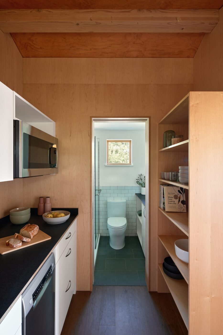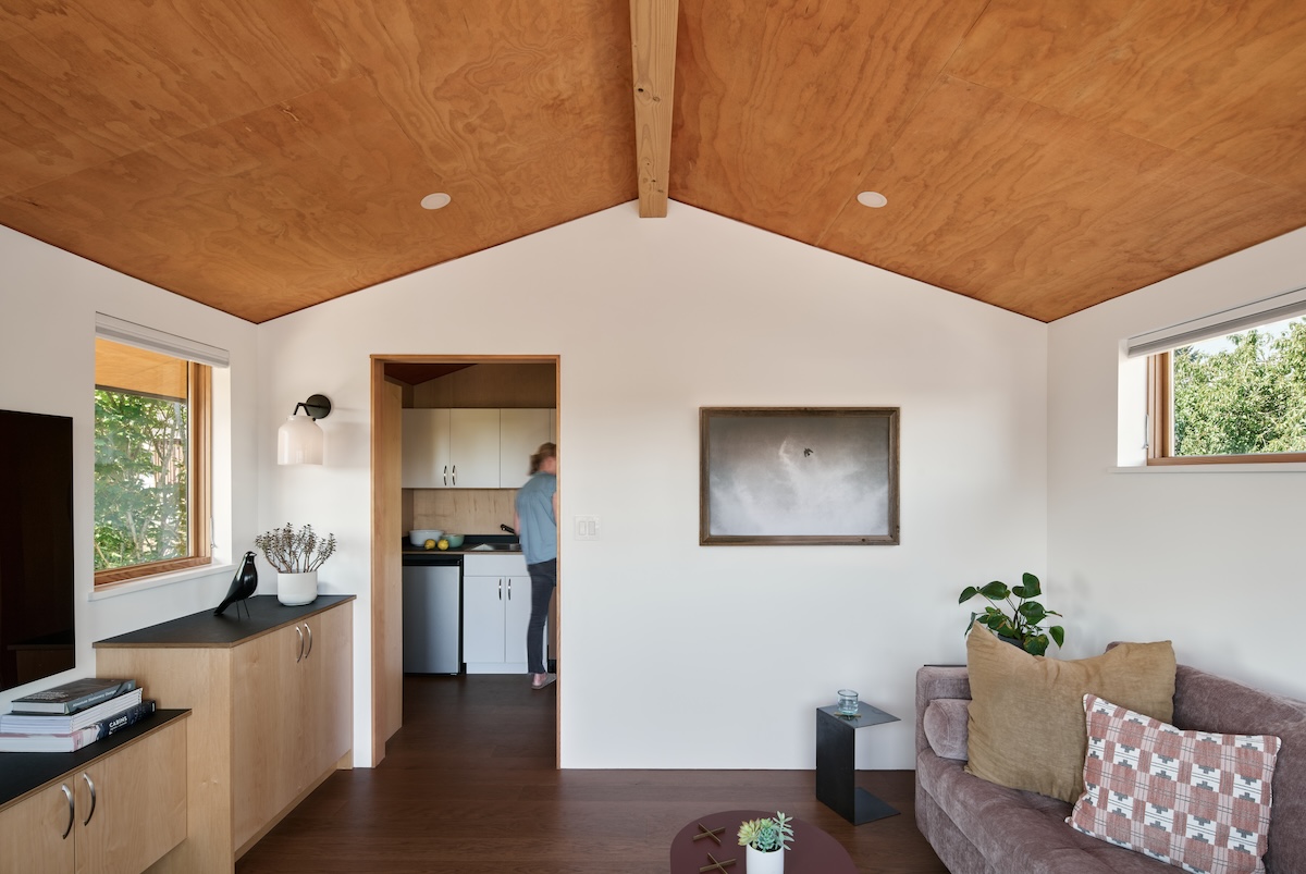 The living space has one small bathroom and kitchenette tucked in the back, with the remaining space open and flexible for guests and friends.
