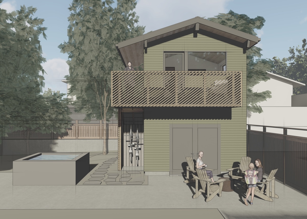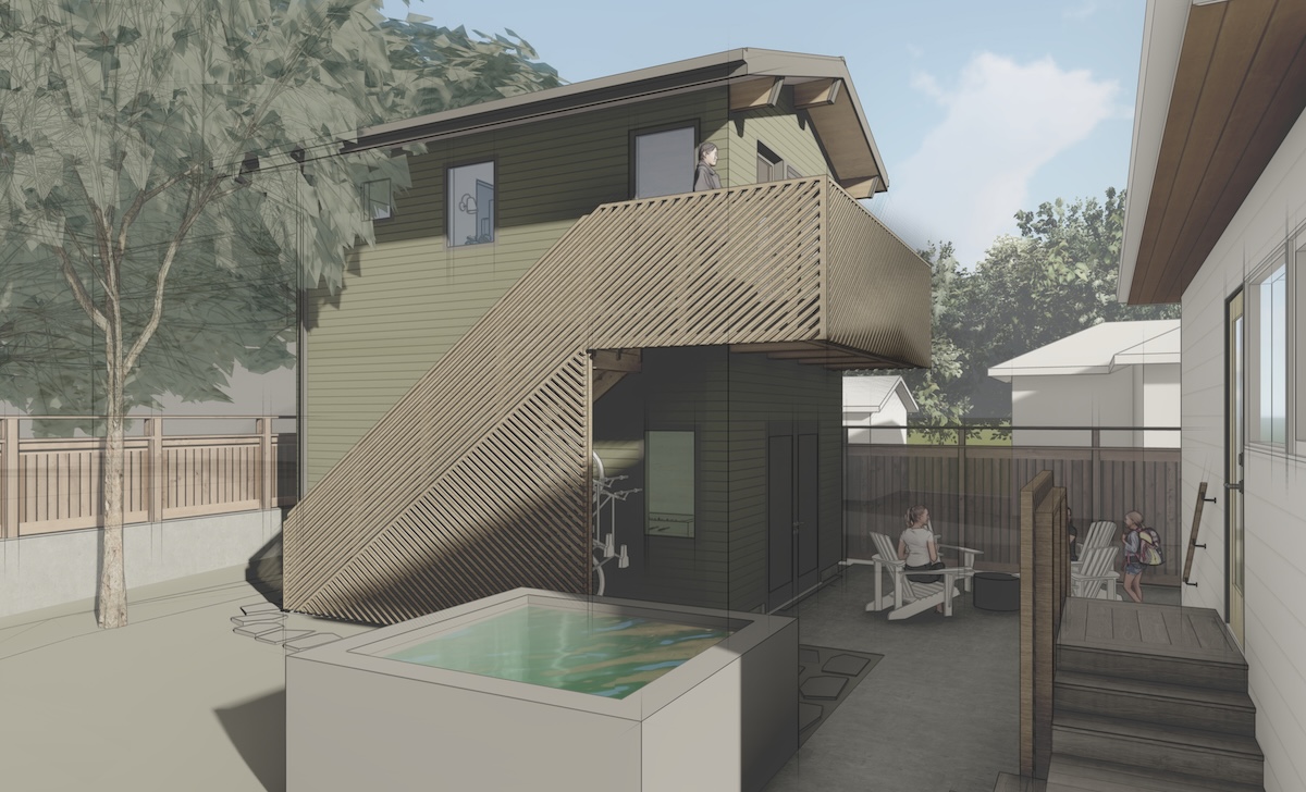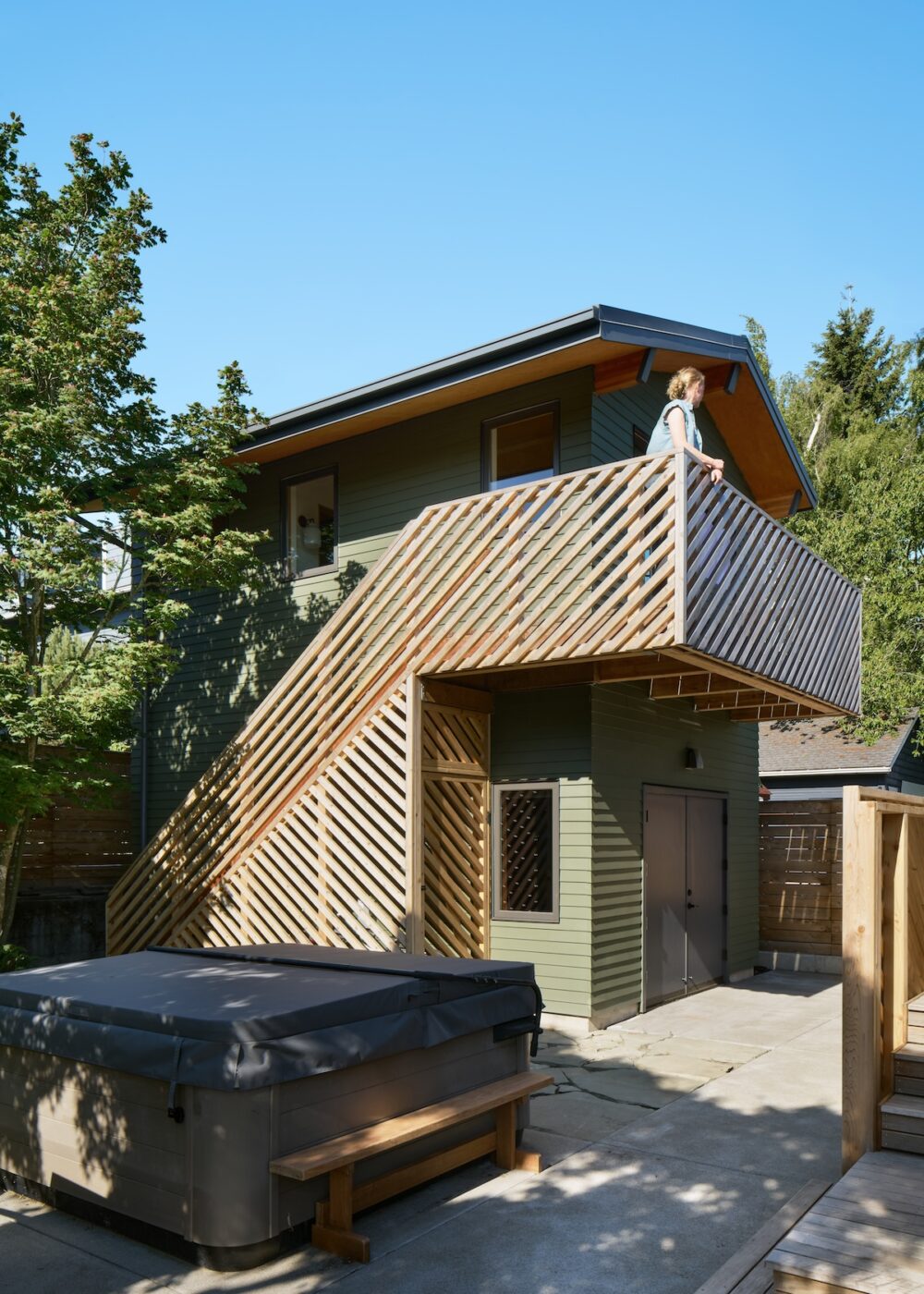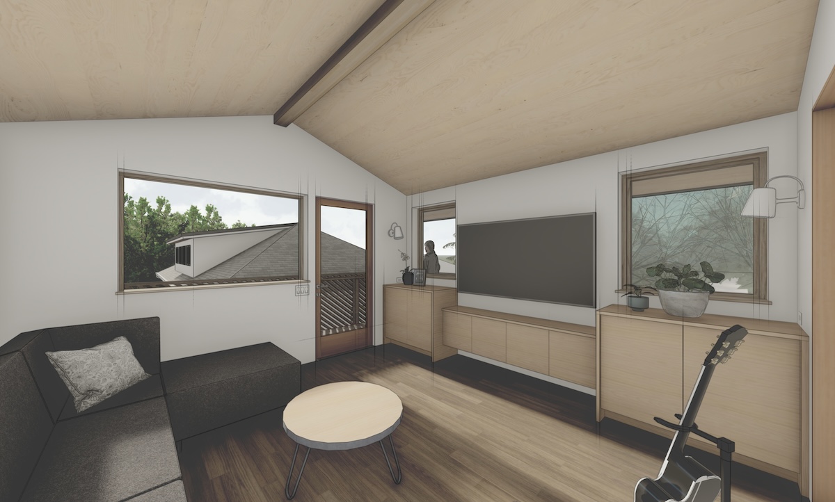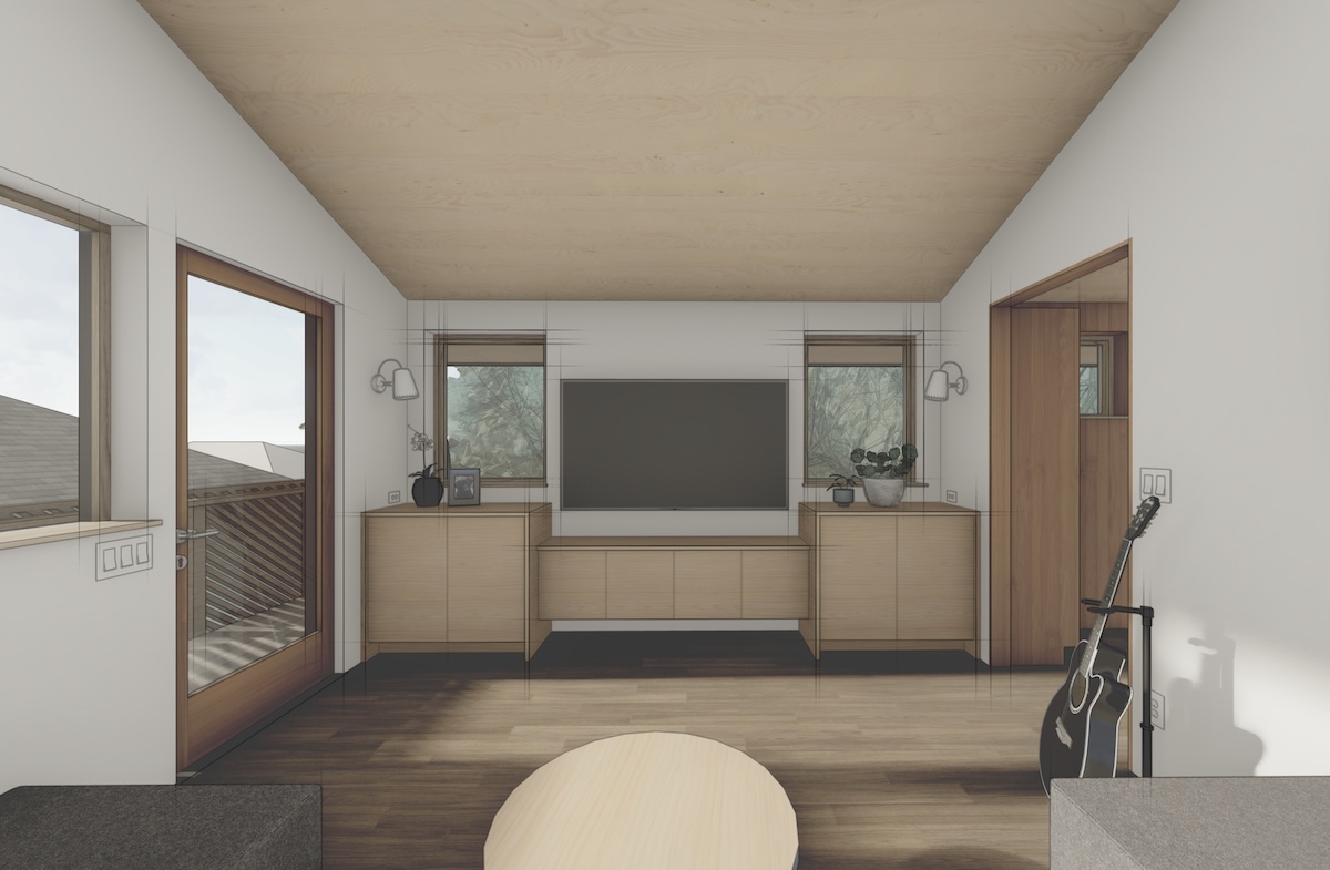The workshop space below is more utilitarian, with double doors that can open up to the patio beyond. An exterior stair frees up interior space while adding a bit of playfulness to the design with the diagonal wood railings. The outdoor unit for the heat pump is strategically placed under the stair, with a removable access screen and just enough space to hang a few bikes.