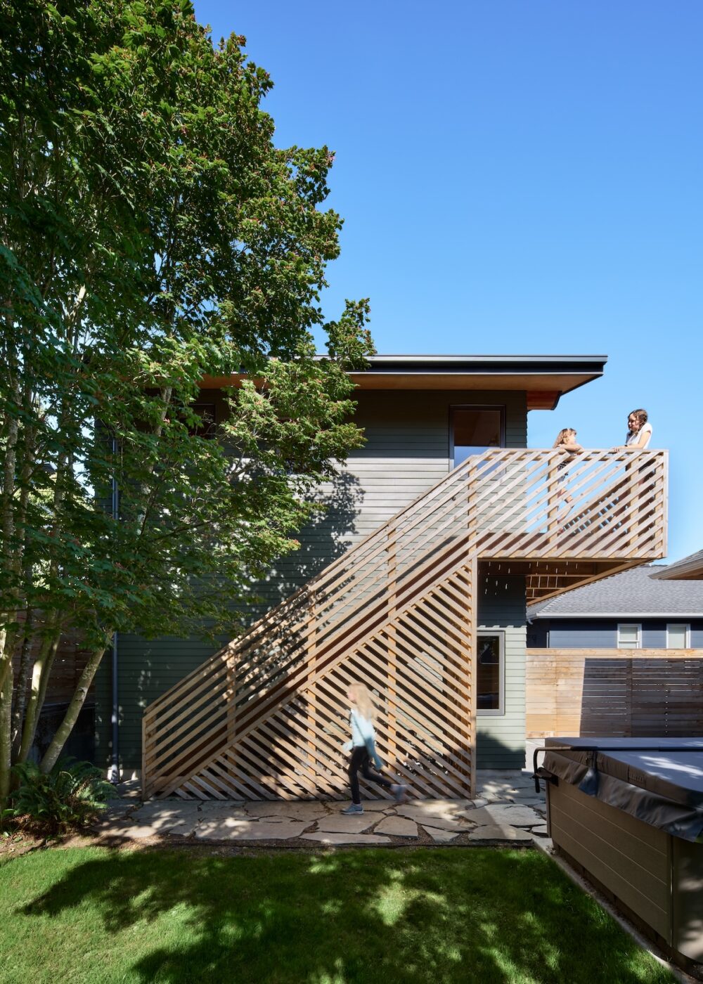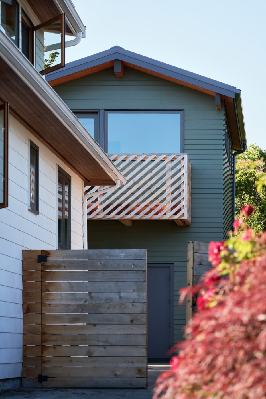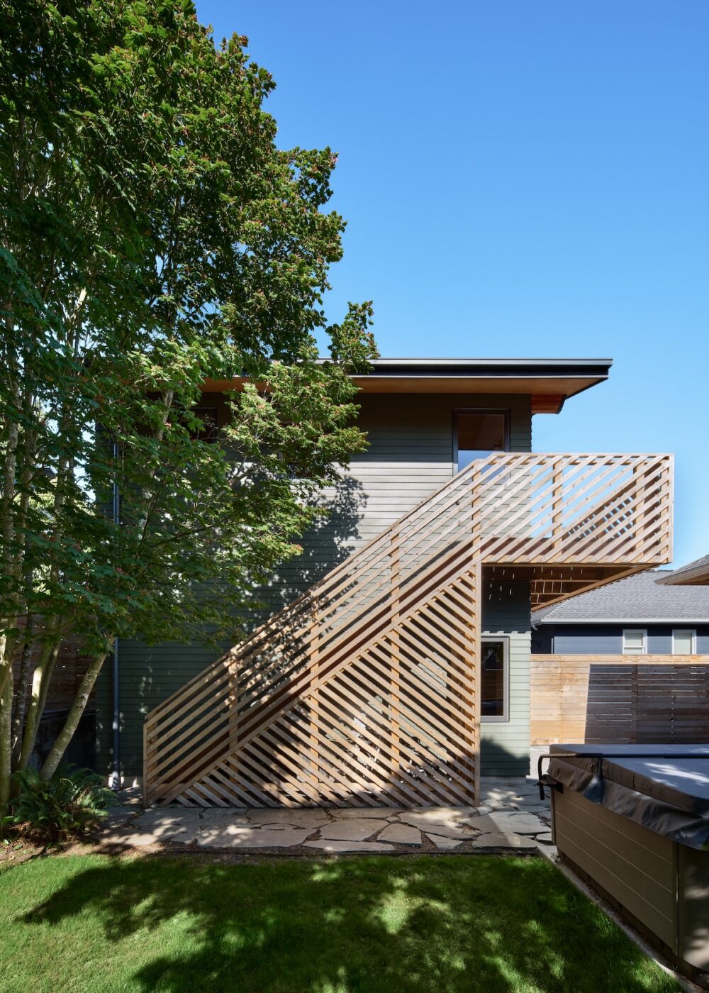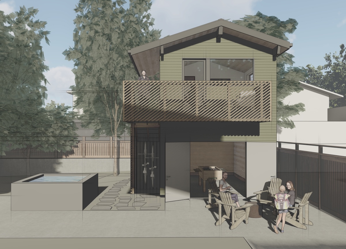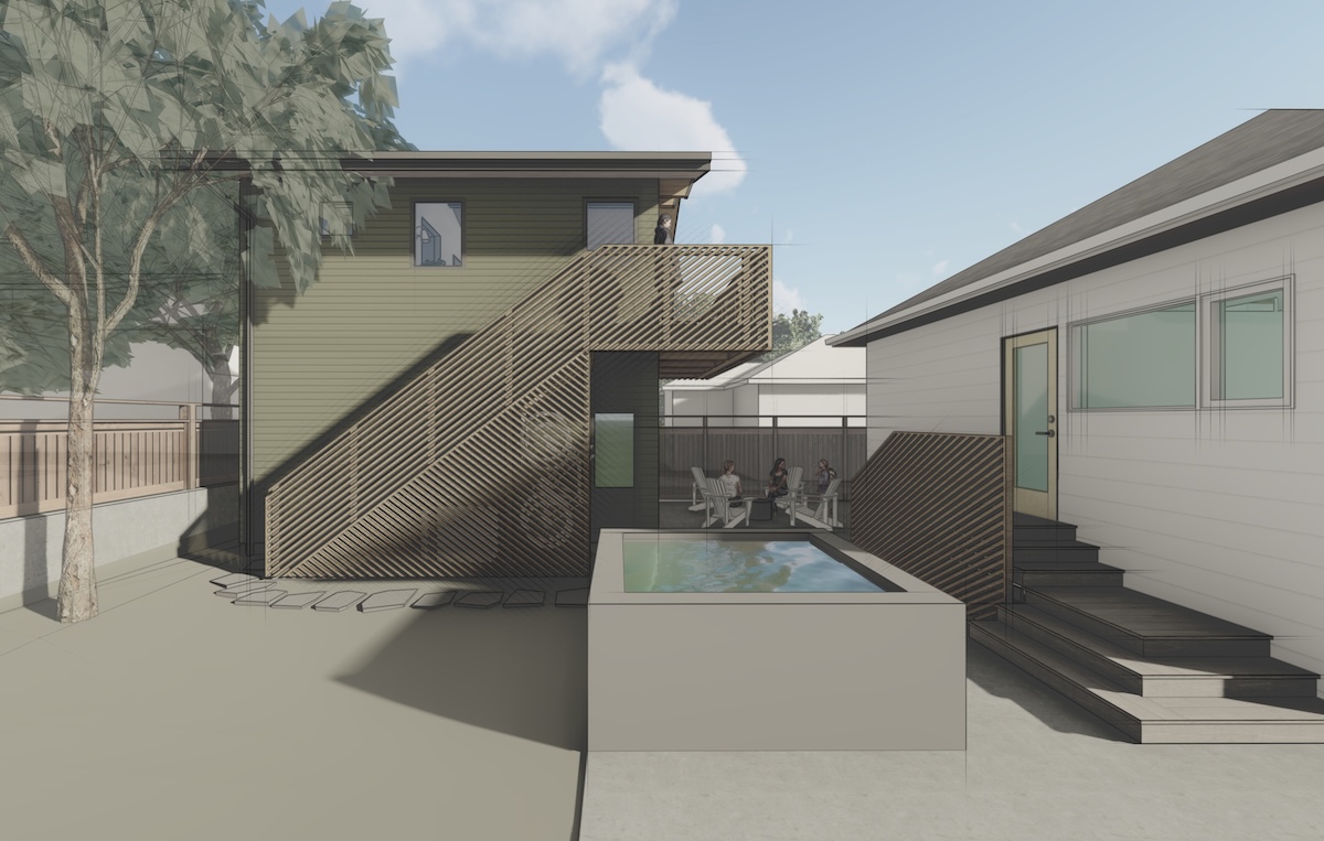 The workshop space below is more utilitarian, with double doors that can open up to the patio beyond. An exterior stair frees up interior space while adding a bit of playfulness to the design with the diagonal wood railings. The outdoor unit for the heat pump is strategically placed under the stair, with a removable access screen and just enough space to hang a few bikes.