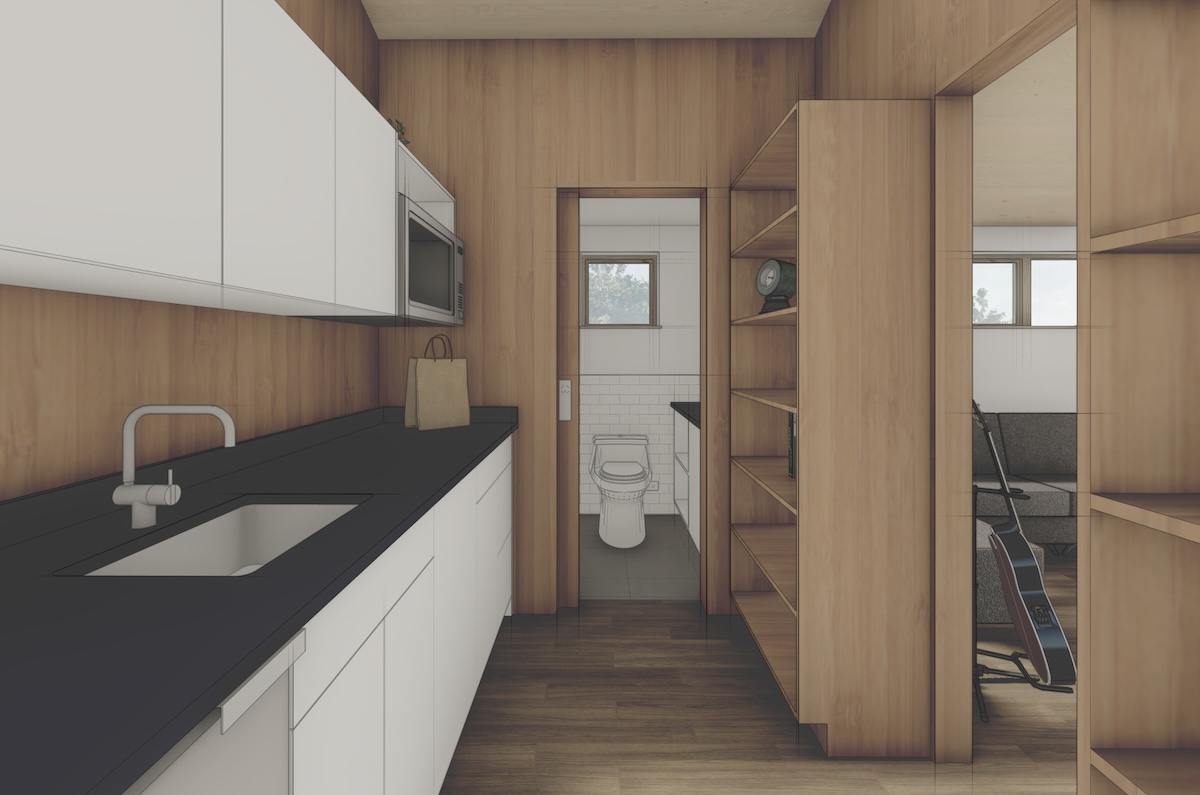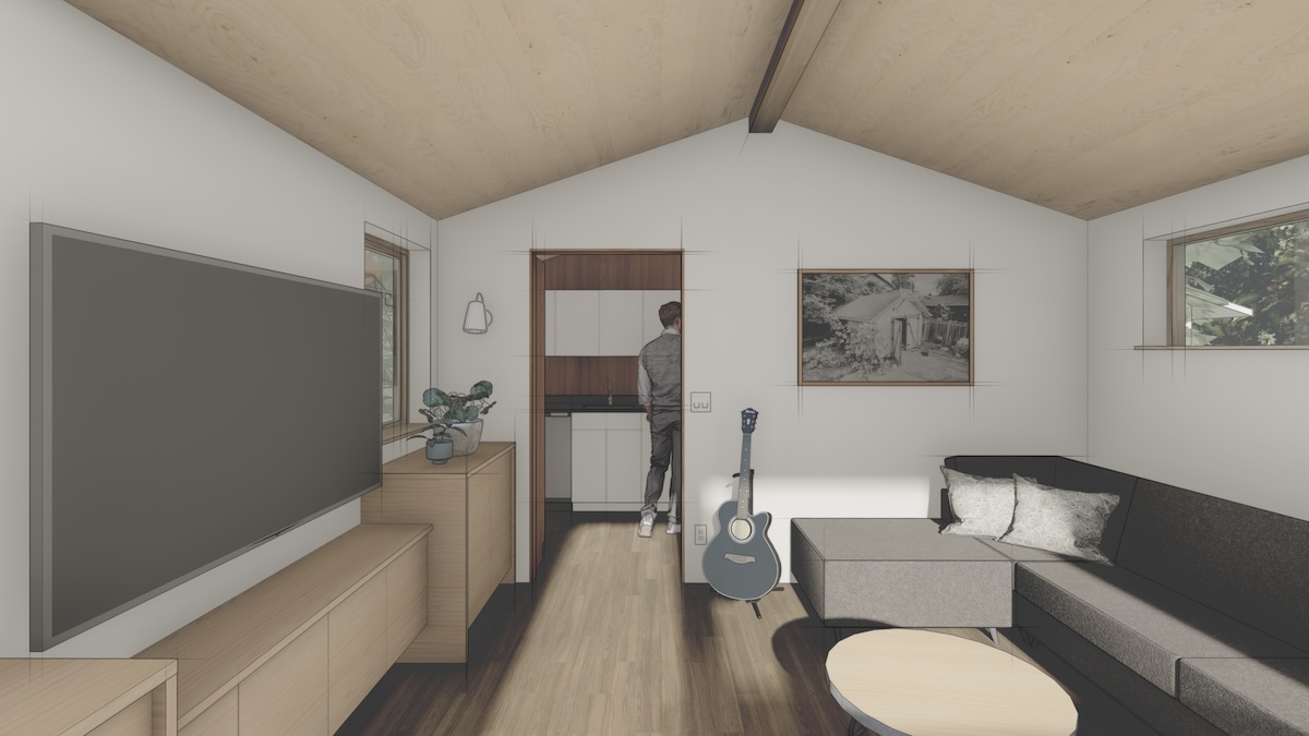 The living space has one small bathroom and kitchenette tucked in the back, with the remaining space open and flexible for guests and friends.