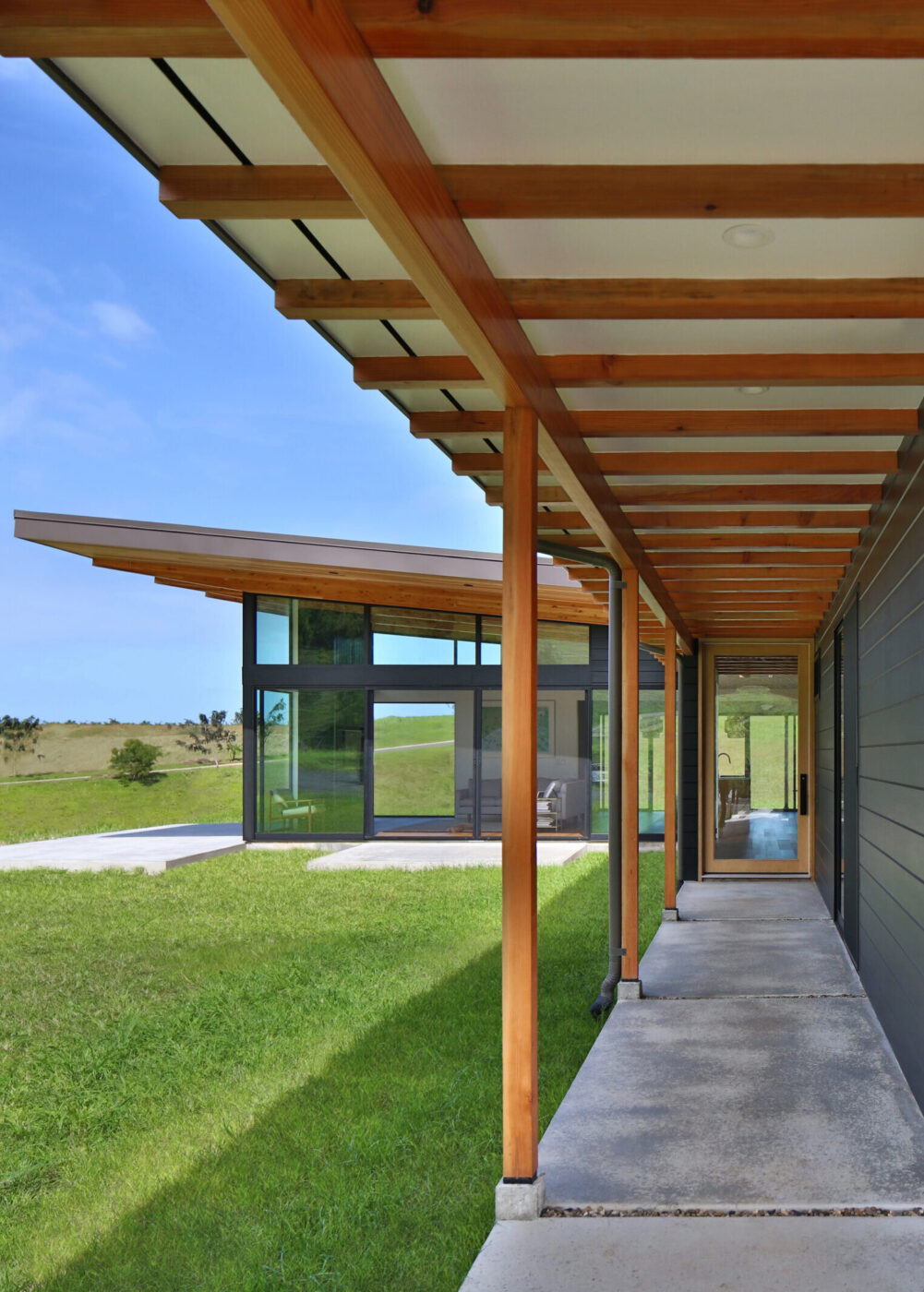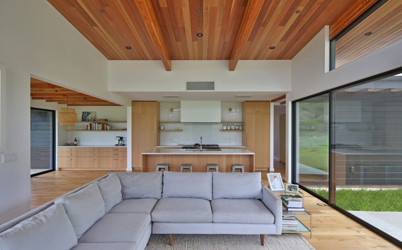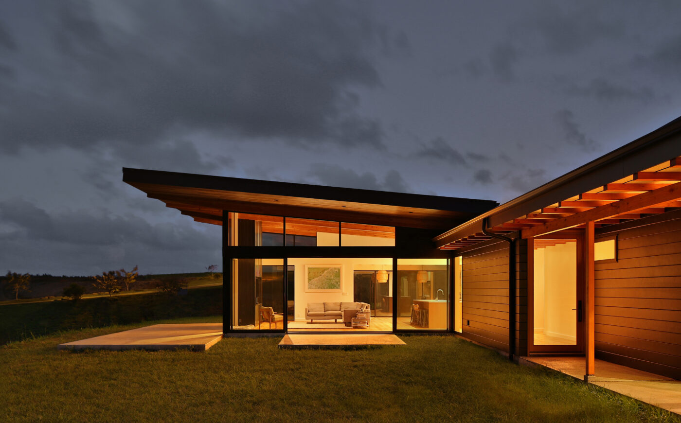 The low-impact home has a modest footprint with a massing that hugs the land and roof forms that gesture to the ridge lines beyond. Contrasting with the exterior, the interiors are bright and clean, with a casual warmth that invites people in.