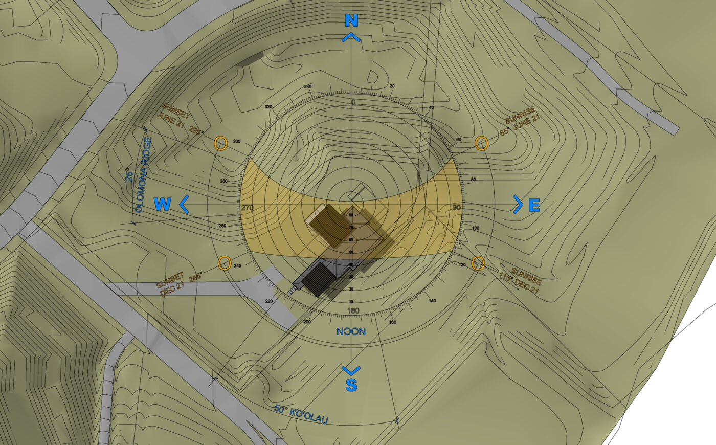 The design is a response to the building site – specifically as it relates to views, prevailing winds (for controlling natural ventilation) and solar exposure throughout each day of the year. The site predominantly experiences prevailing trade winds from the NE and occasional Kona winds from the SW.