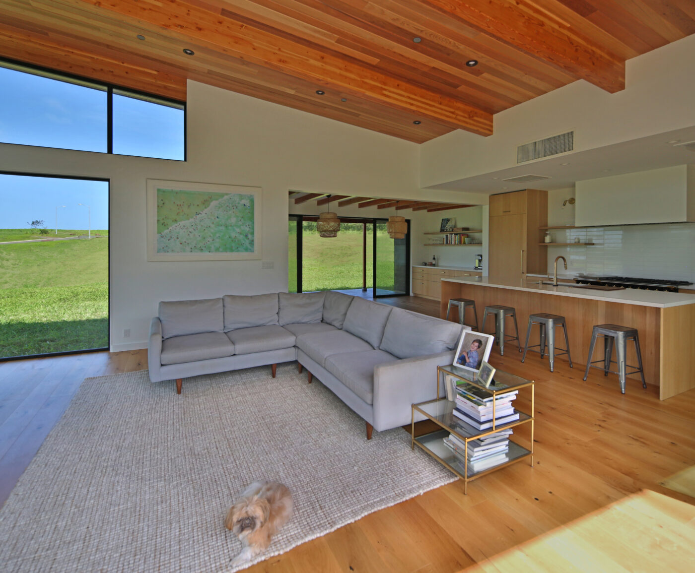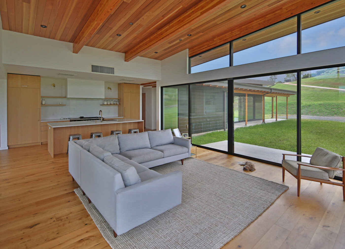The low-impact home has a modest footprint with a massing that hugs the land and roof forms that gesture to the ridge lines beyond. Contrasting with the exterior, the interiors are bright and clean, with a casual warmth that invites people in.