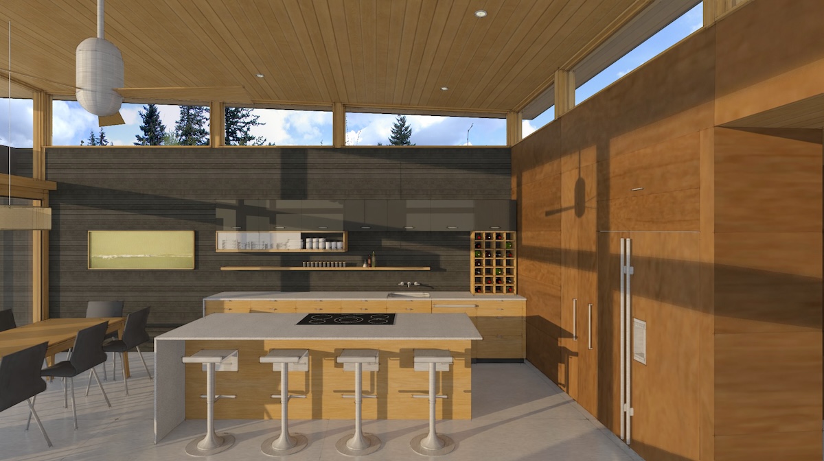 The house is designed with 3 bedrooms and 2 baths, attached garage on the main floor and a walkout basement below. From the street the home maintains a low profile to respect the neighbor’s views. The western half of the house is less restrained and contains a voluminous great room that extends to a cantilevered deck. A large concrete fireplace creates a visual anchor for the living space. The materials palate is natural with warm tones and detailed with a modern sensibility.
